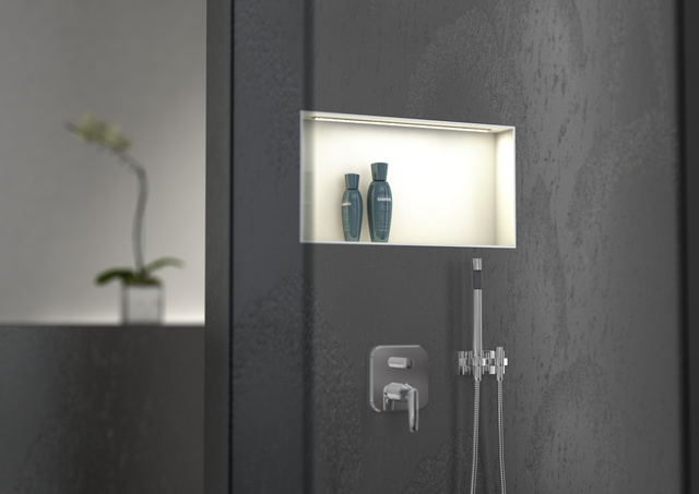 Die wedi Sanwell Top LED Nischen wurden passgenau für die wedi Sanwell Nischen entwickelt. Die warmweiße LED Lichtleiste ist bereits werkseitig integriert, abgedichtet und speziell für die Nutzung im Nassraum geeignet.